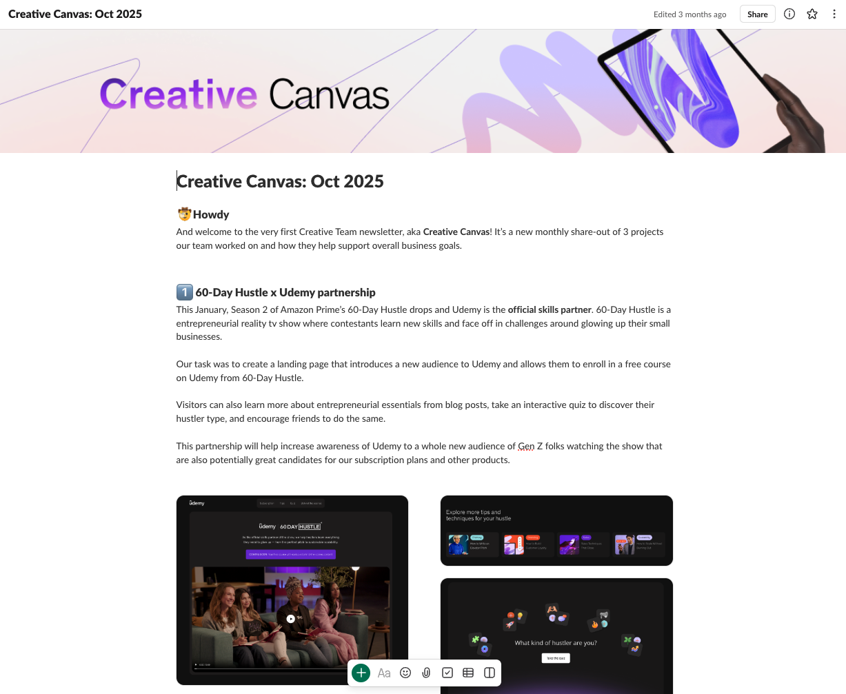 If you aren’t consistently sharing what your creative team is doing, it will be taken for granted. To champion my team’s contributions, I started a creative team newsletter shared monthly via Slack Canvas. It’s focused on highlighting 3 projects that make an impact on current company goals.